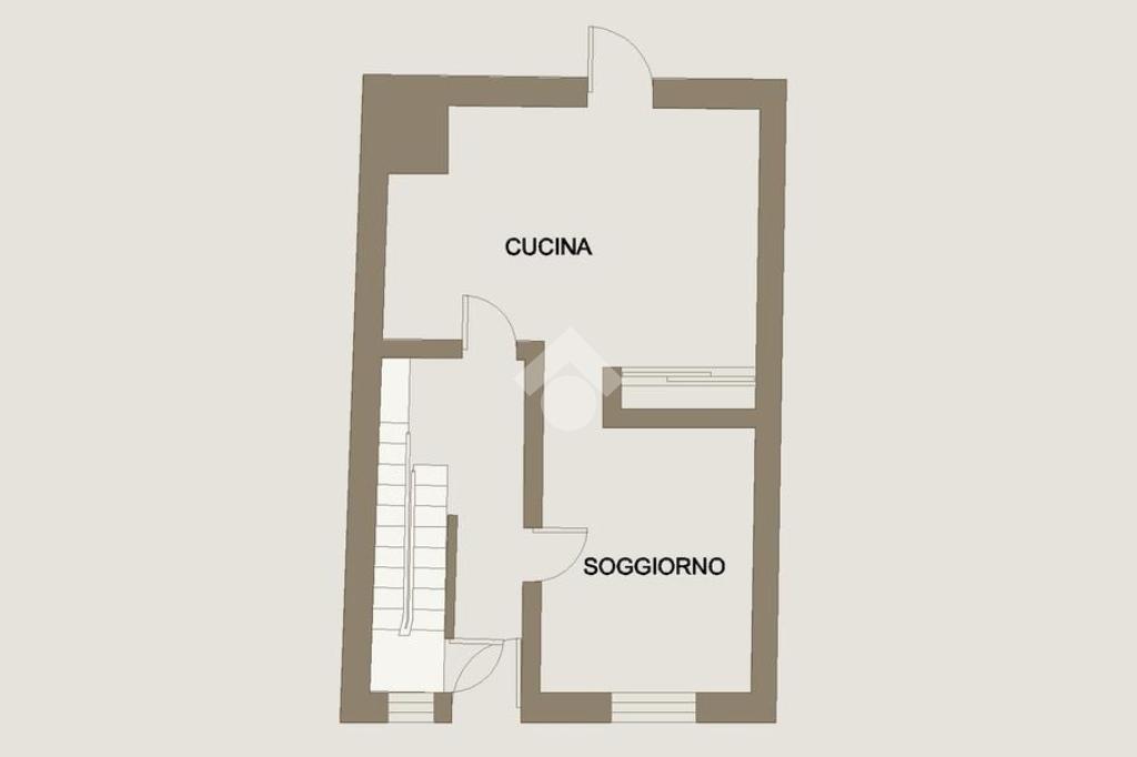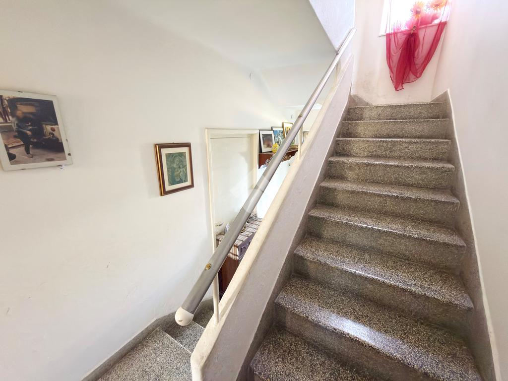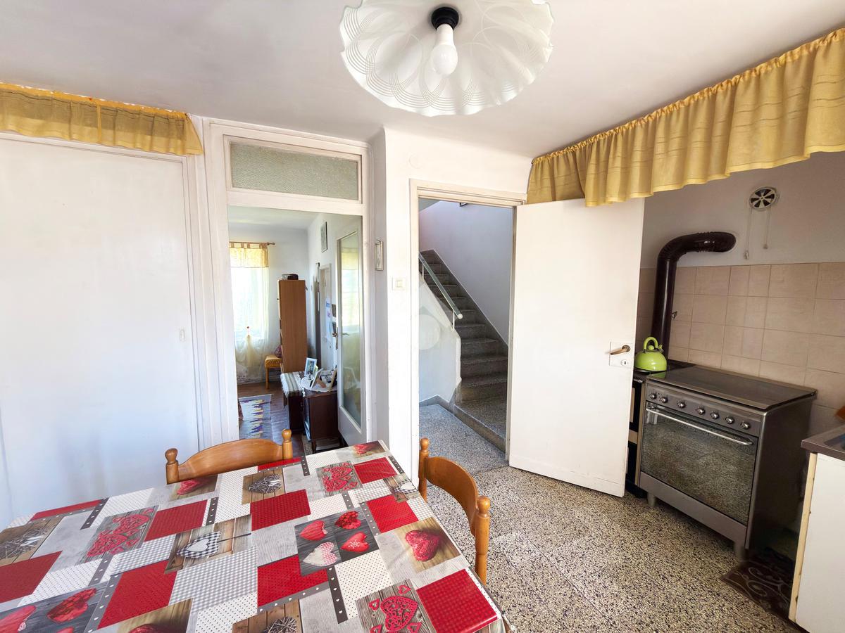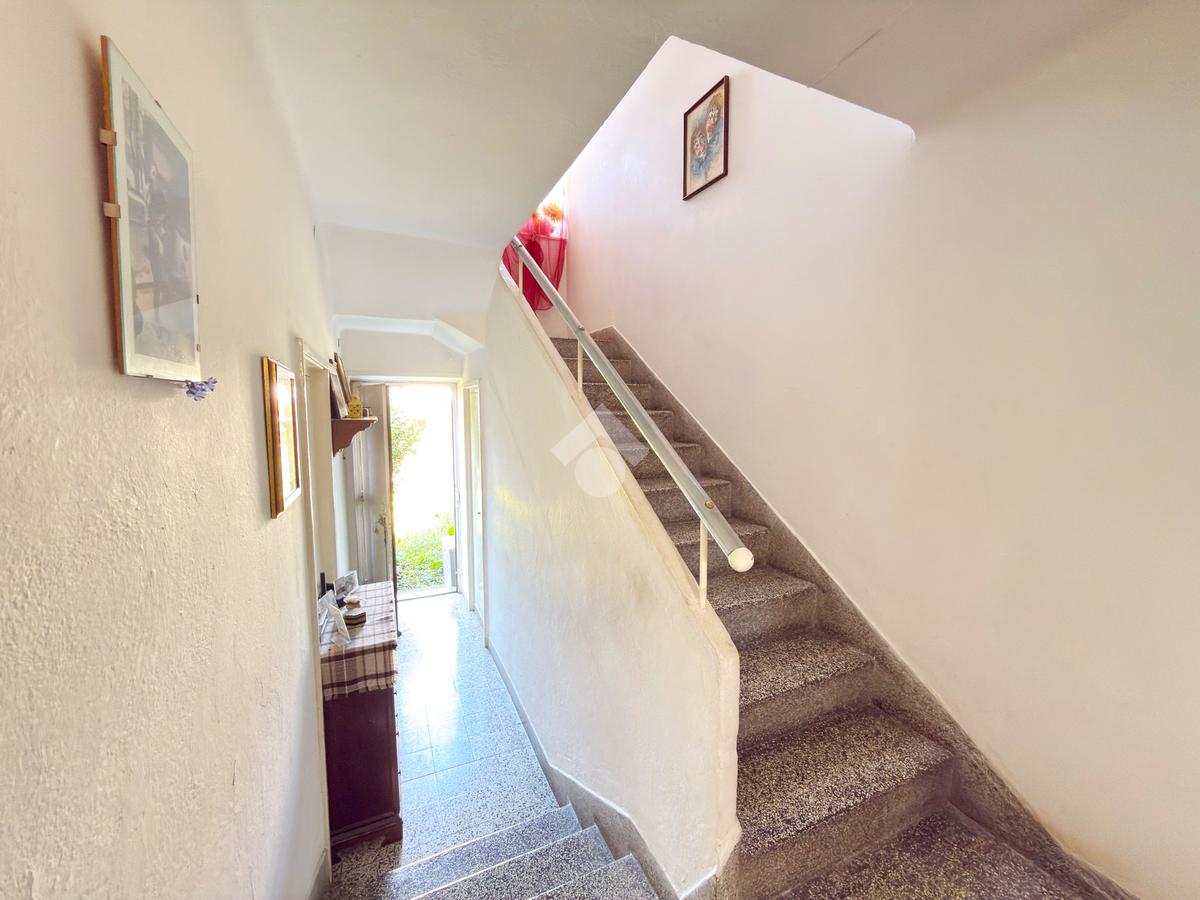 Al piano terra troviamo un'ampia e luminosa cucina con sala da pranzo, un soggiorno e un comodo ripostiglio sottoscala. Dal disimpegno che porta al primo piano abbiamo accesso anche al primo dei due giardini dell'abitazione