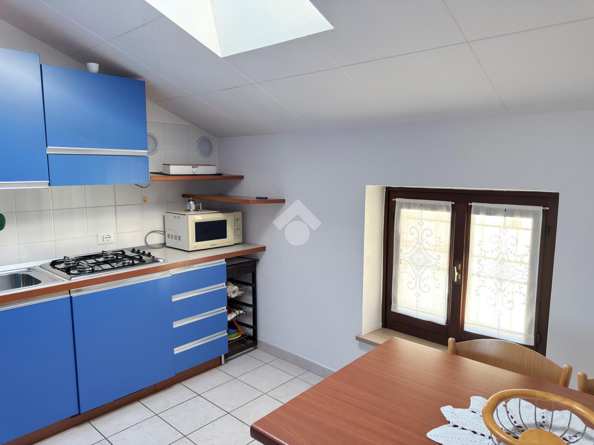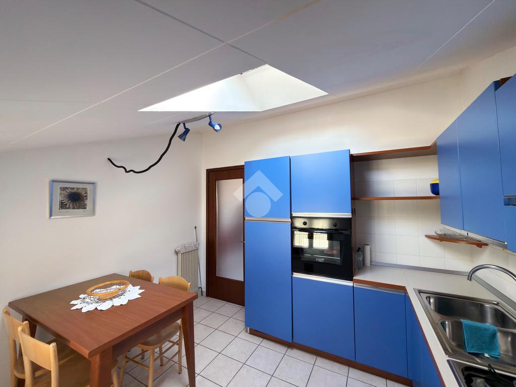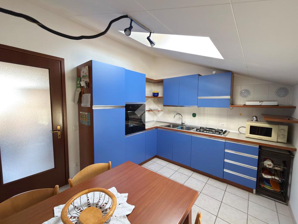 Dal soggiorno abbiamo poi accesso alla cucina che dati gli spazi ci permette di inserire al suo interno anche un tavolo da pranzo.